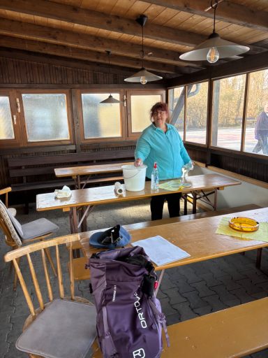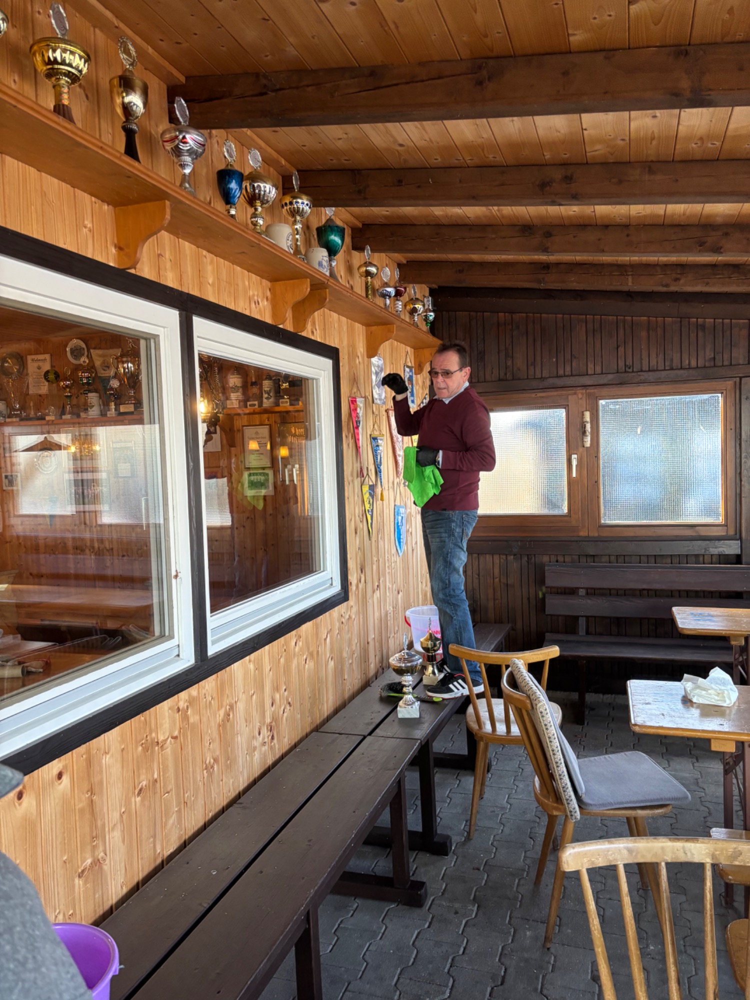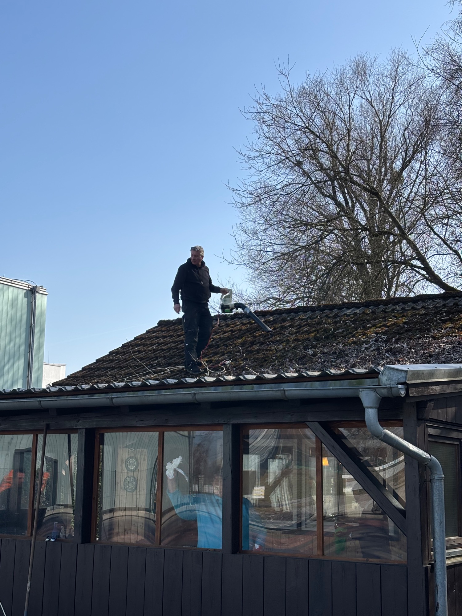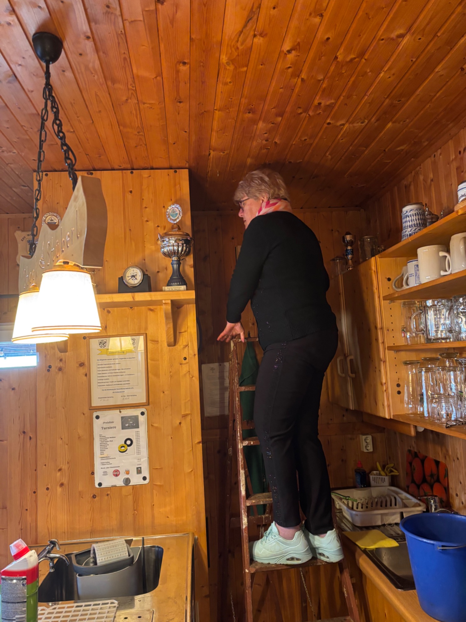 Geputzt wurde Innen und Außen. Pokale abgestaubt, Fächer und Krüge auf Links gedreht. Das Dach vom Laub befreit, kaputte Ziegel ausgetauscht, verstopfte Abflüsse frei gemacht und neue Steine verlegt. Das Laub wurde von den Flächen entfernt. Alles blitzt und blinkt nun wieder...Nach getaner Arbeit wurde natürlich gemeinsam Brotzeit gemacht.